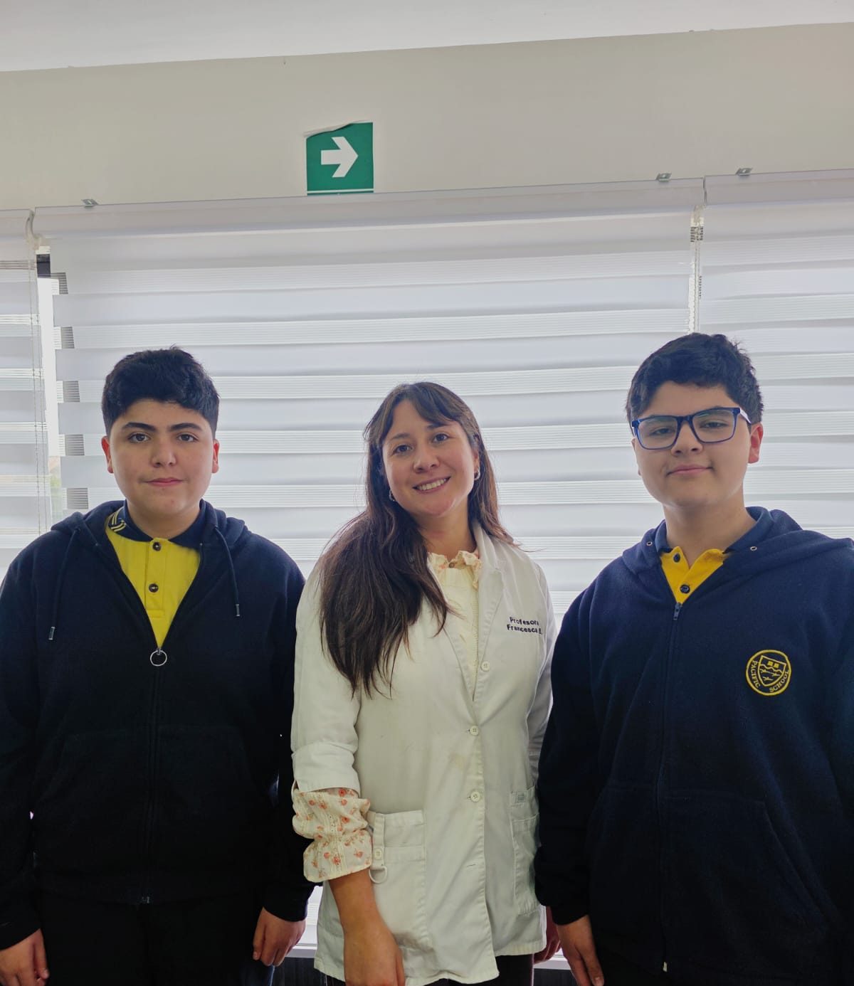Los estudiantes de 1° medio A, Maximiliano Bravo y Gonzalo San Martín, junto a su profesora Francesca Salas, avanzaron a la segunda …